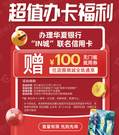 同時(shí)辦理華夏銀行“IN城”聯(lián)名信用卡,還贈(zèng)住店圈全場(chǎng)通用100元無門檻抵用券,超值福利火熱來襲。