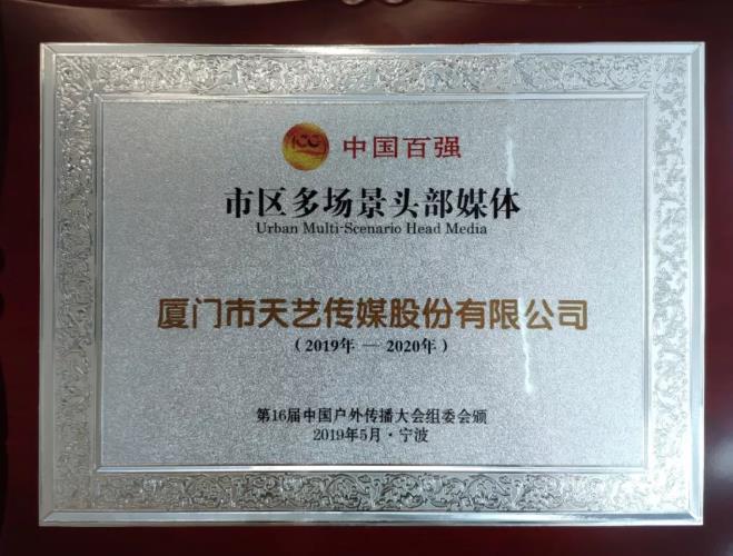 廈門(mén)市天藝傳媒股份有限公司創(chuàng)立于1993年,業(yè)務(wù)范圍覆蓋品牌管理、創(chuàng)意策劃、整合營(yíng)銷、媒體投放等傳播鏈條。公司發(fā)展26年,在戶外傳媒領(lǐng)域極具市場(chǎng)競(jìng)爭(zhēng)優(yōu)勢(shì),形成了城市路名牌、公交候車亭、站名牌、廈門(mén)國(guó)際郵輪中心媒體、廈門(mén)航空艙內(nèi)媒體、廈門(mén)機(jī)場(chǎng)手推車、網(wǎng)約車媒體等“海·陸·空”360°全媒體覆蓋。在此次會(huì)議中,廈門(mén)市天藝傳媒股份有限公司有幸榮獲《中國(guó)百?gòu)?qiáng)市區(qū)多場(chǎng)景頭部媒體》的獎(jiǎng)項(xiàng)。