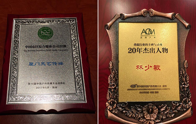 在剛剛落幕的第14屆中國戶外傳播大會上,廈門市天藝傳媒股份有限公司憑借20余年的媒體經(jīng)營實力、誠信可靠的行業(yè)口碑及強(qiáng)大的市場占有率,在第六屆中國百強(qiáng)媒體評選中,從眾多優(yōu)質(zhì)候選企業(yè)中脫穎而出,榮獲“中國市區(qū)綜合媒體公司20強(qiáng)”稱號。作為戶外廣告行業(yè)的標(biāo)桿人物,天藝傳媒董事長林少敏被授予“20年杰出人物”榮譽稱號!