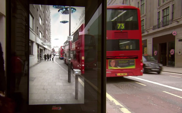 數(shù)字戶外,創(chuàng)意無(wú)限。比方說,百事在倫敦的候車亭屏幕上做過的AR廣告,讓等車的人可以看到UFO、飛人、老虎等動(dòng)態(tài)畫面,看起來(lái)就像是真的一樣,如果事先沒有準(zhǔn)備的話,人可能會(huì)被嚇到。
